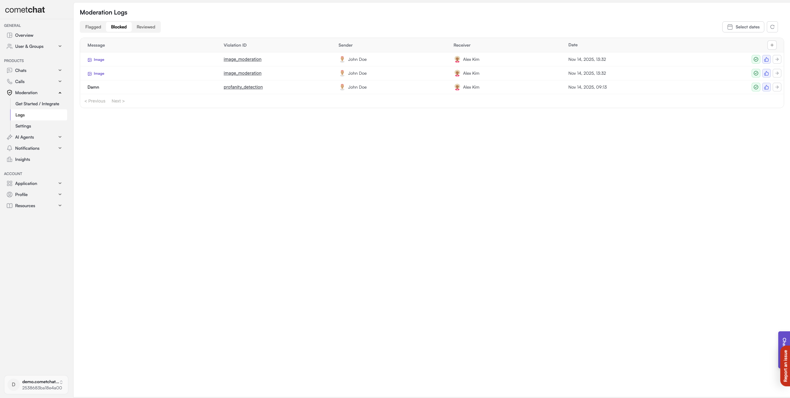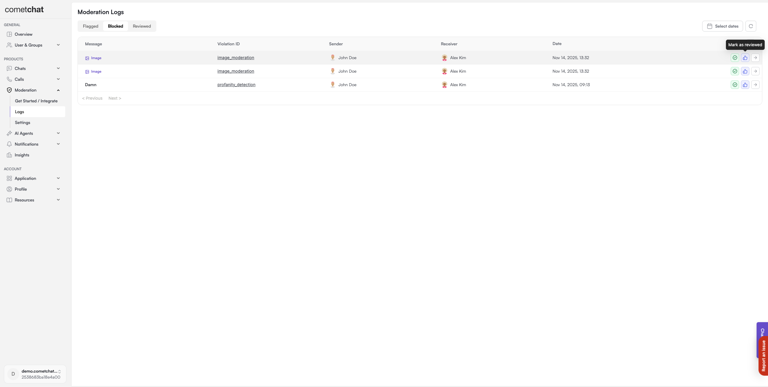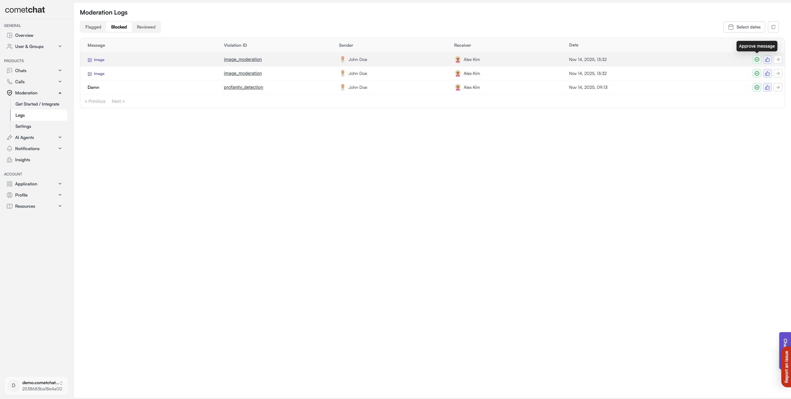 Allows the approval of messages previously blocked due to moderation violations. Approving a blocked message automatically marks it as reviewed, showing that it has been checked and is okay.