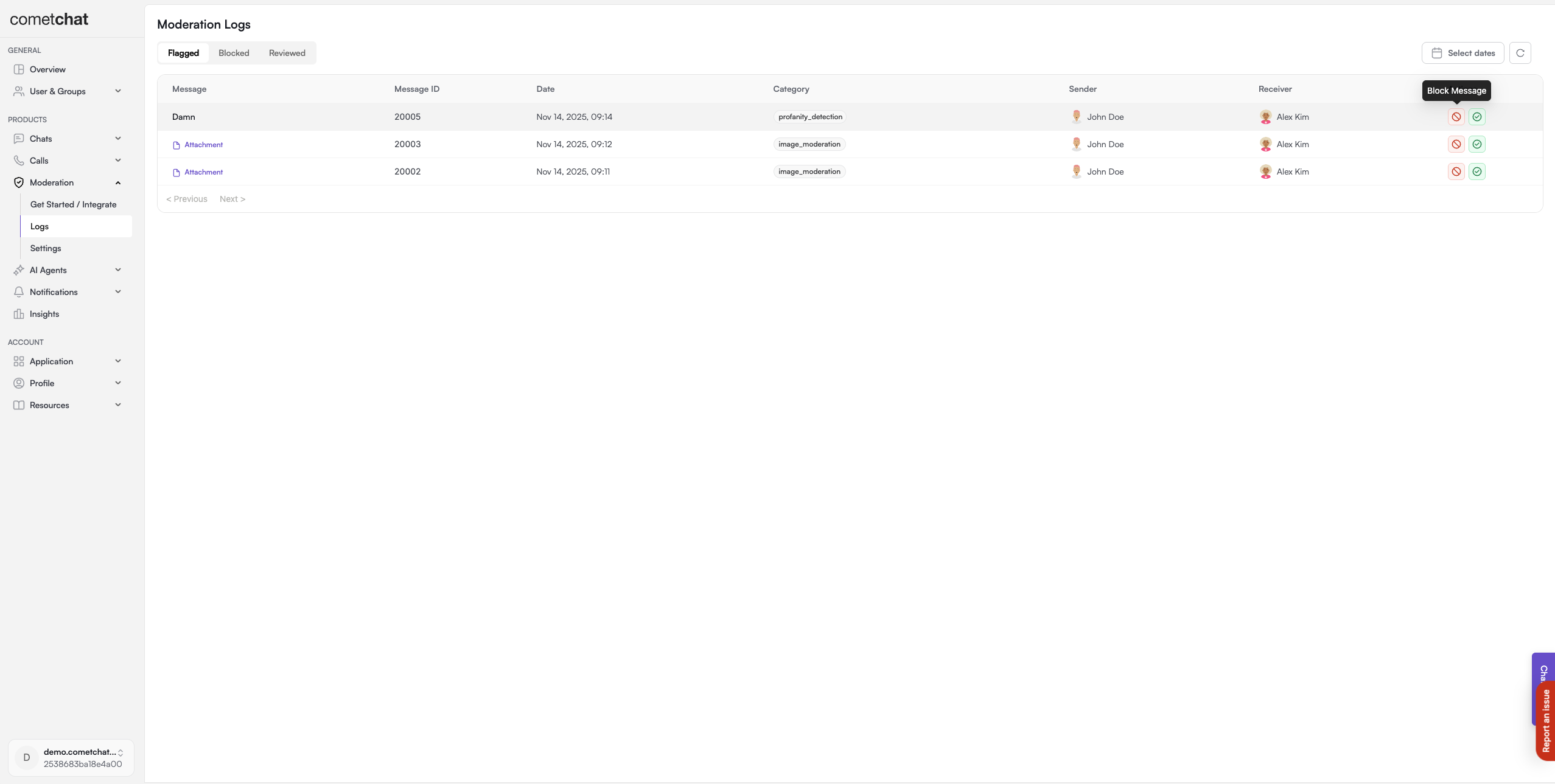The Flagged Messages endpoint in the Moderation Service API enables app owners and collaborators to review messages that have been flagged for potentially violating moderation rules. Messages can be flagged automatically by the rule engine based on predefined rules, or manually by end users who find certain content inappropriate or concerning. When a message is flagged, it becomes visible in the CometChat Dashboard under the flagged messages section. Moderators can then review these flagged messages and take one of two actions:- Approve - The message is deemed acceptable and the moderation status remains approved