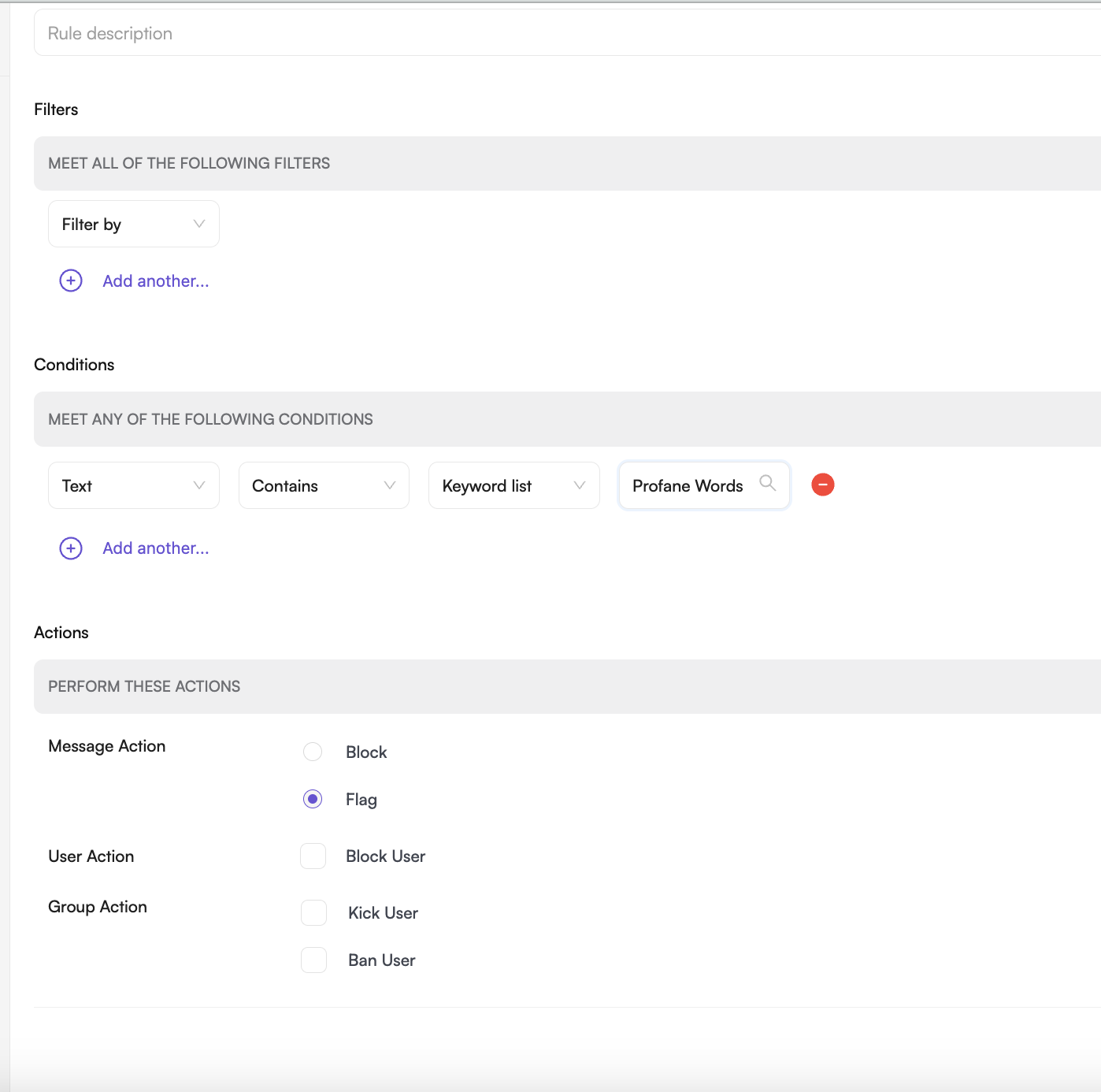 Messages can be automatically flagged when they violate predefined moderation rules. When setting up moderation rules in the Dashboard, you can configure the action to “flag” messages that match specific criteria. This ensures that potentially problematic content is automatically identified and queued for review without requiring manual intervention from users. For e.g. if the message contains any profane words, then it would be automatically flagged.