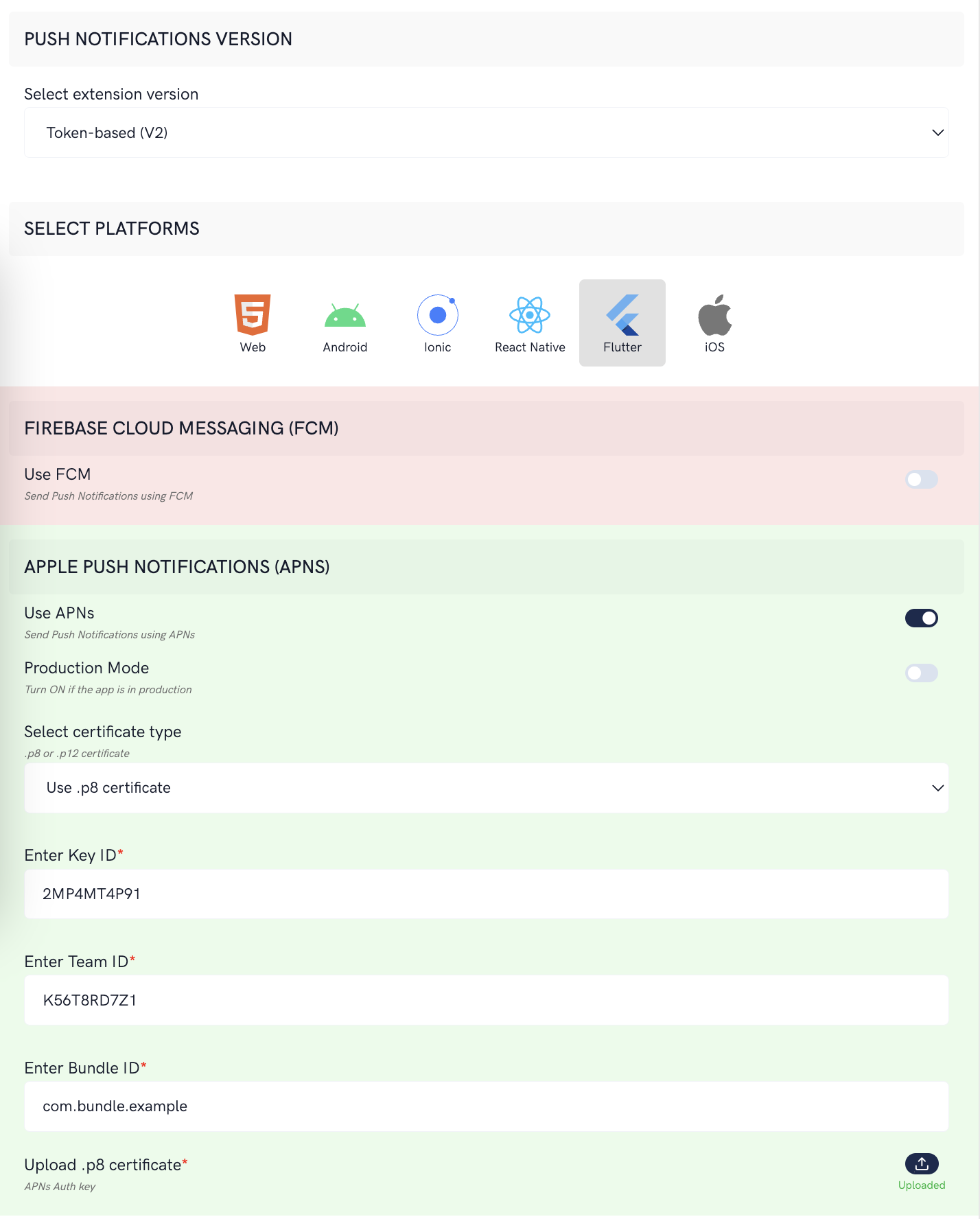 - Save the Team ID, Key ID, Bundle ID and upload the p8 certificate obtained from Apple Developer console.