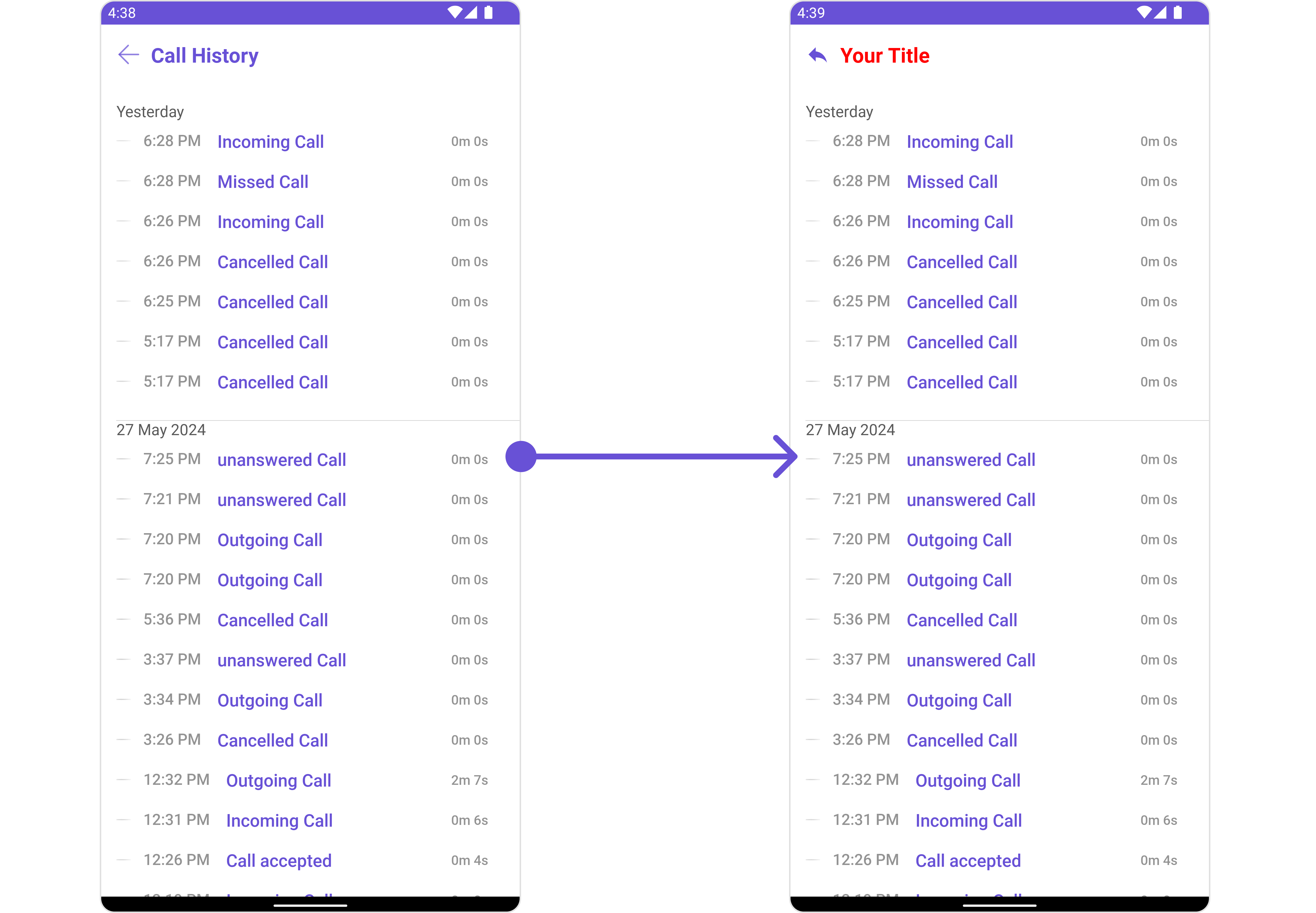 | Header Separator Color | Used to set the color of the divider separating the CallLog items | .setHeaderSeparatorColor(@ColorInt int) |