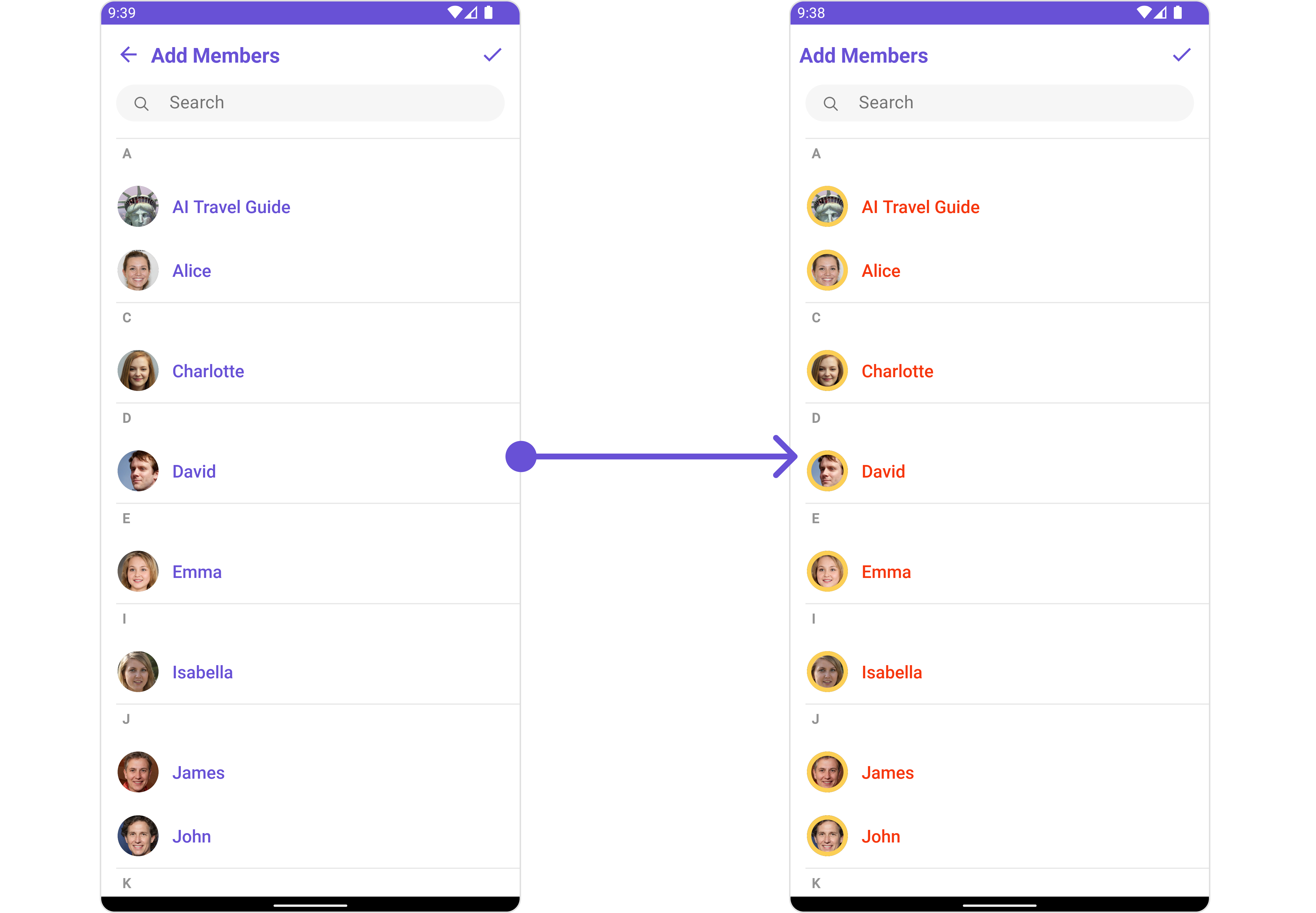 All exposed properties of AddMembersConfiguration can be found under Add Members. Properties marked with the 🛑 symbol are not accessible within the Configuration Object. Example Let’s say you want to change the style of the Add Members subcomponent and, in addition, you only want to show the back button. You can modify the style using the ListItemStyle property and AvatarStyle property