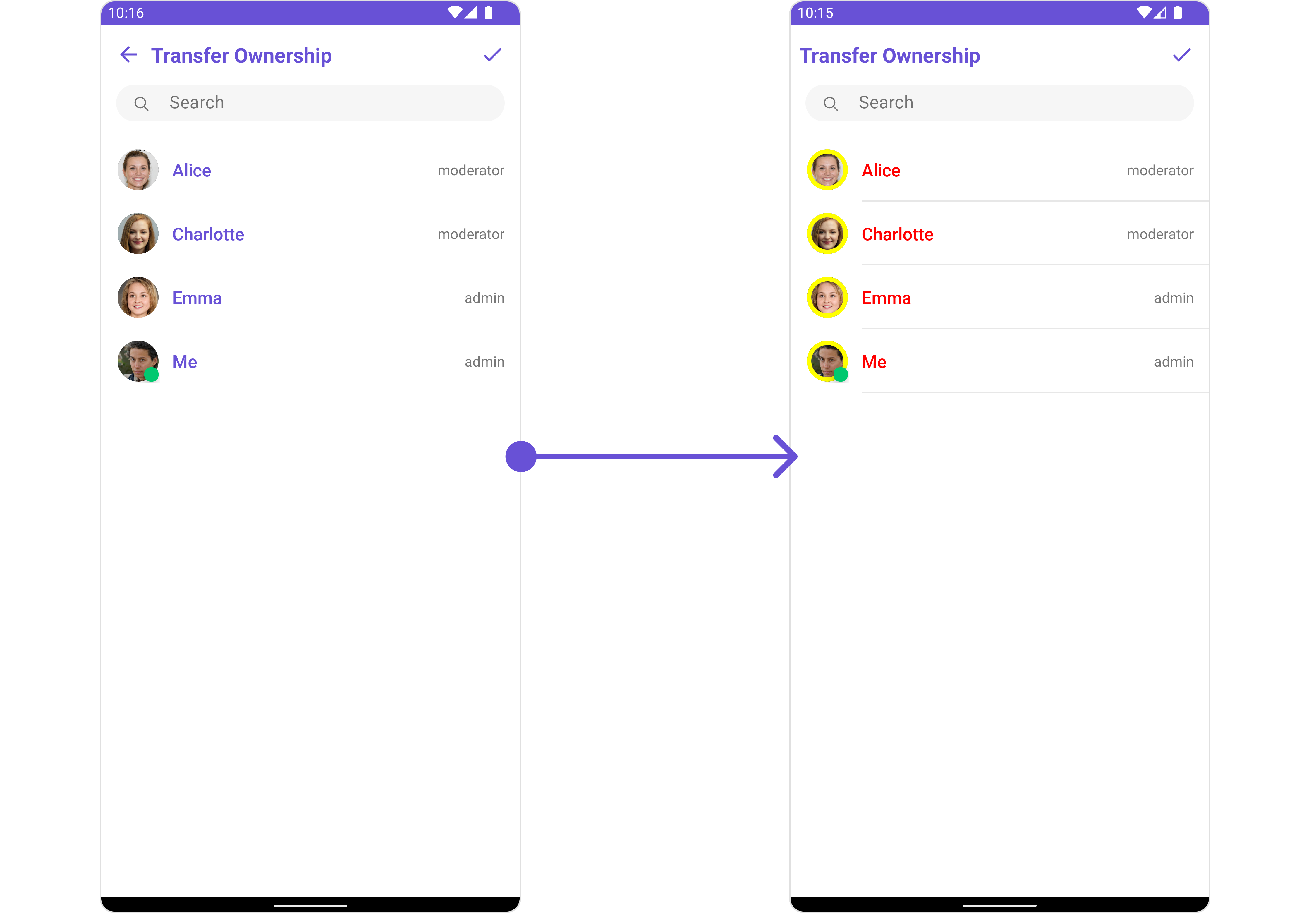 All exposed properties of TransferOwnershipConfiguration can be found under Transfer Ownership. Properties marked with the 🛑 symbol are not accessible within the Configuration Object. Example Let’s say you want to change the style of the Transfer Ownership subcomponent and, in addition, you only want to show the back button. You can modify the style using the ListItemStyle property and AvatarStyle property