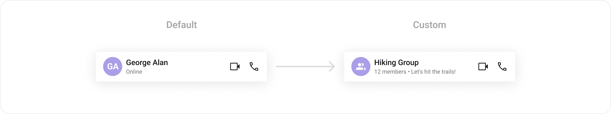 ListItem WidgetThis component’s widget consists of avatar, status indicator , title, and subtitle. The fields are then mapped with the SDK’s user, group class.