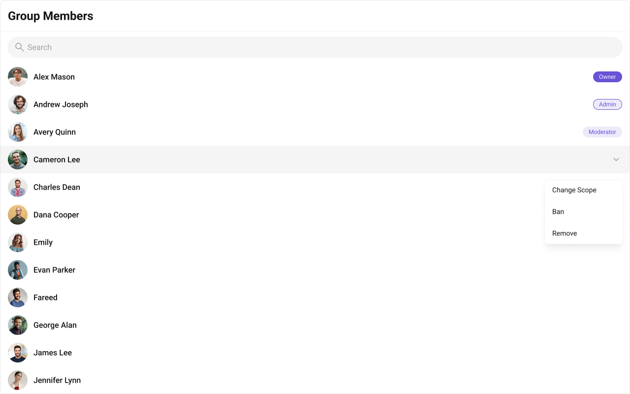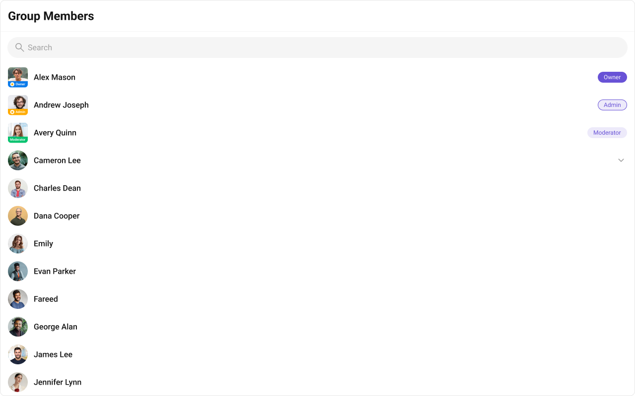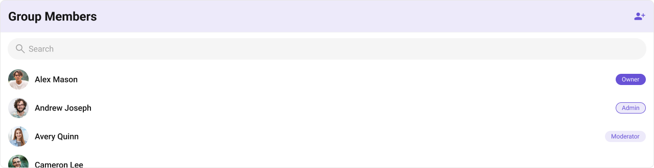 CometChatGroupMembers is a Component that displays all users added or invited to a group, granting them access to group discussions, shared content, and collaborative features. Group members can communicate in real-time via messaging, voice and video calls, and other activities. They can interact, share files, and join calls based on group permissions set by the administrator or owner.