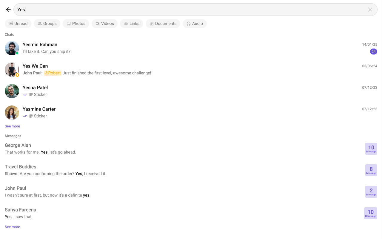Search FiltersList of filters to be rendered in the Search component.searchFilters={[CometChatSearchFilter.Messages, CometChatSearchFilter.Photos, CometChatSearchFilter.Audio, CometChatSearchFilter.Documents]}